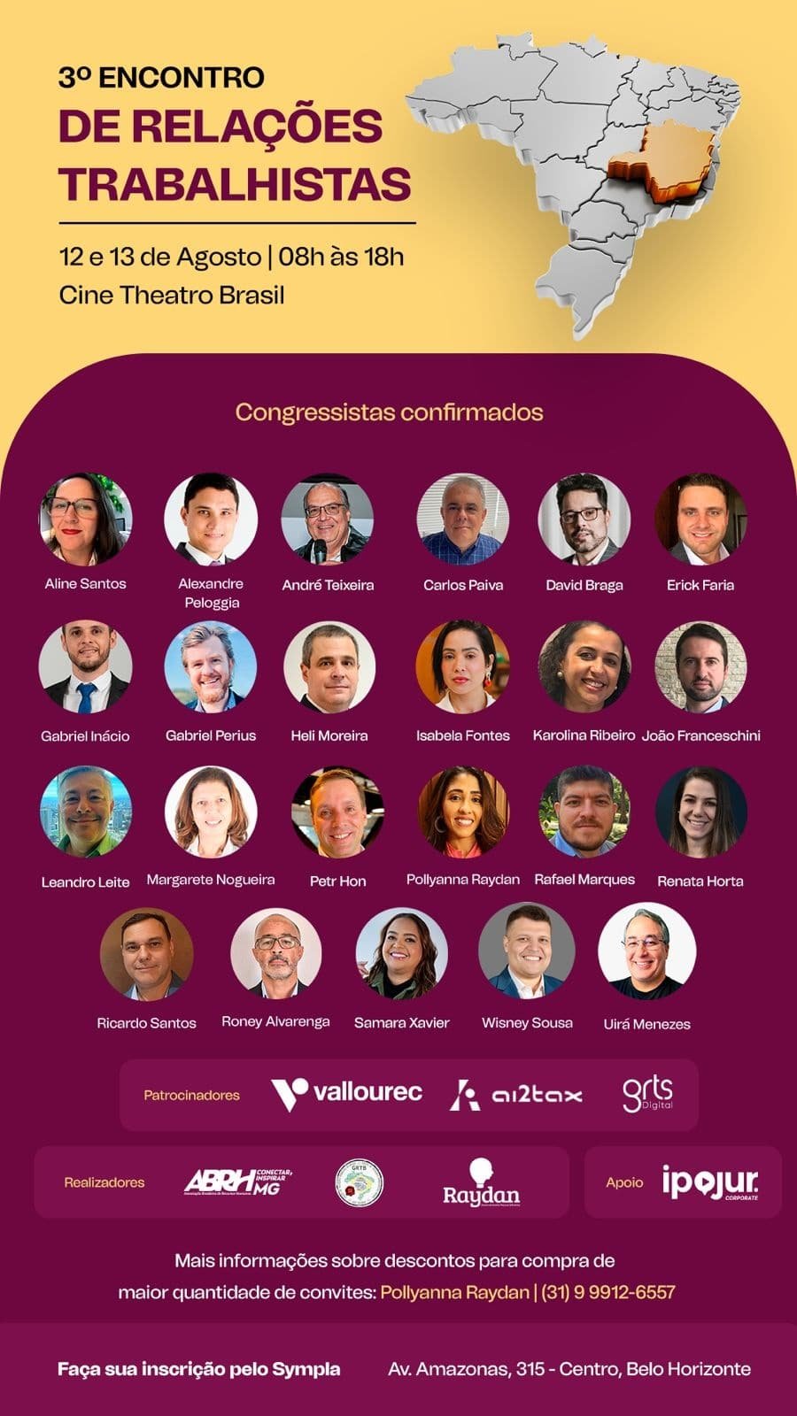 Inscrições: Sympla – Página oficial do evento – https://www.sympla.com.br/evento/3-encontro-de-relacoes-trabalhistas-12-e-13-de-agosto-de-2025-belo-horizonte/2988790?d=ABRHMG&referrer=www.linkedin.com