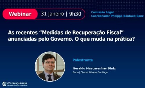 Nesta terça-feira (31), às 9h30, a Comissão Legal da CCIFB-SP promove o webinar “As recentes “Medidas de Recuperação Fiscal” anunciadas pelo Governo. O que muda na prática?” com a participação do advogado Geraldo Mascarenhas L. C. Diniz, sócio do escritório Chenut Oliveira Santiago. A mediação e coordenação será de Philippe Boutaud-Sanz.