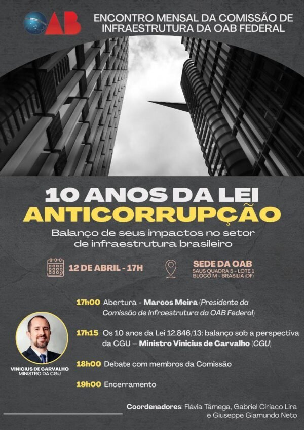 A Comissão de Infraestrutura da Ordem dos Advogados do Brasil realiza, nesta quarta-feira (12), a partir das 17h, evento sobre os 10 anos da Lei Anticorrupção (Lei 12.846/2013). O debate acontece na sede da OAB, em Brasília.