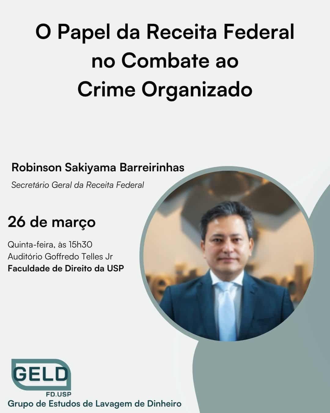 O Grupo de Estudos de Lavagem de Dinheiro da Faculdade de Direito da USP (GELD-FDUSP) promove, na próxima quinta-feira (26/3), um debate sobre o papel da Receita Federal no combate ao crime organizado. O encontro contará com a participação do secretário geral do órgão, Robinson Sakiyama Barreirinhas, e será realizado às 15h30, no Auditório Goffredo Telles Jr., na faculdade. O evento é aberto ao público.