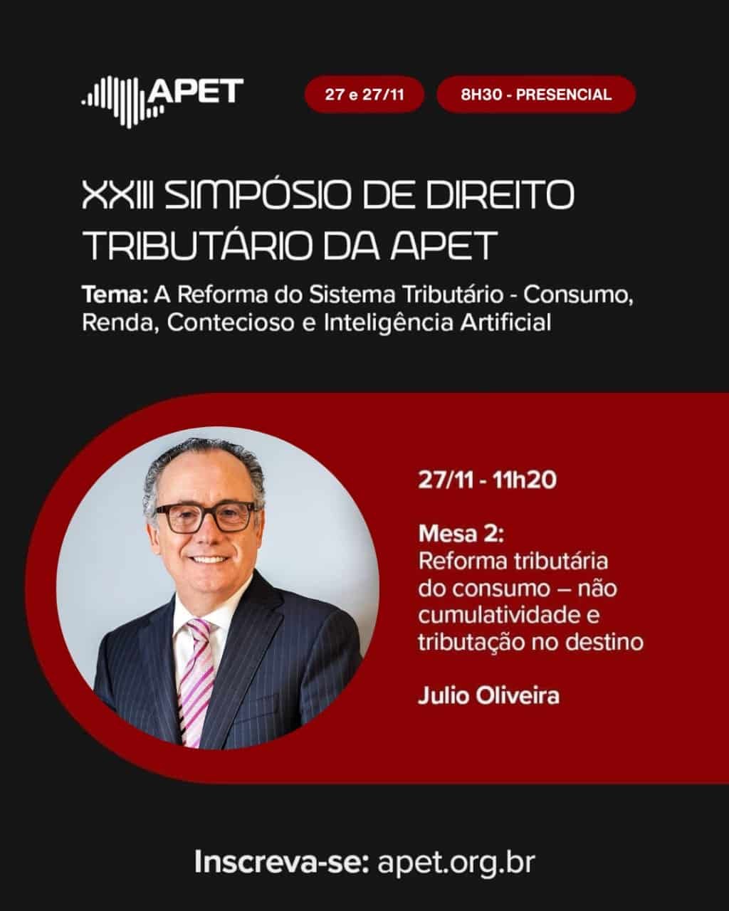 Júlio de Oliveira, sócio do escritório Machado Associados, estará na Mesa 2 no dia 27, às 11h20, para tratar de Reforma Tributária do Consumo, com foco em não cumulatividade e tributação no destino.