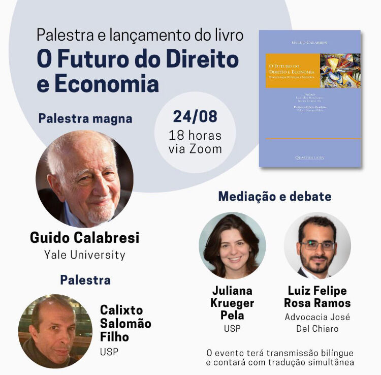 Acontece nesta terça-feira (24), às 18h, via Zoom, o webinar de lançamento do livro “O Futuro do Direito e Economia”, que contará com palestra magna do professor Guido Calabresi e palestra do professor Calixto Salomão.